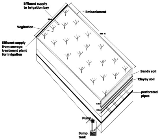 The basic theme of FILTER is based on the reuse of wastewater for cropping after filtration through constructed of a soil/rock column to subsurface drainage followed by collection in a sump tank. Large volumes of wastewater can be treated in a small footprint area, and great environmental benefits can be achieved [30]. A schematic diagram of the FILTER technique is illustrated in Figure 4.