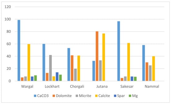 In order to find suitable neutralization material, sampling was carried out in the study area to select an appropriate variety of limestone. The Salt Range is full of stratigraphical succession and different geological formations, including many types of sandstone, shales and limestones. Several pure and famous limestones varieties can be found here, including Wargal Limestone, Lockhart Limestone, Chorgali Formation, Sakesar Limestone, Nammal Limestone, and a dolomite variety known as Jutana Dolomite. A summative geochemistry based on conventional petrography, XRD, and EDS techniques is presented in Figure 5.