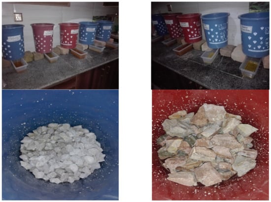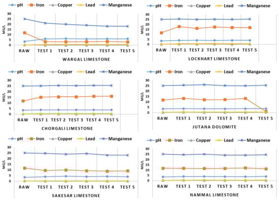 After finalizing the design and laboratory setup, neutralization rate experiments were conducted with different types of limestones selected and picked from Salt Range areas; see Figure 7. Different parameters such as retention time, effects of armouring by Fe(OH)3 coating, and encrustation in limestone surfaces were studied following the methodology from [5,54]. The rate of neutralization within experiments was expected to increase, as per [54,55]. Net acidity can be determined by understanding the contribution protons (H+; pH) and metals such as Fe, Cu, Cd, and Mn and the negative contribution from alkalinity as net acidity. After conducting lab-scale experiments, Wargal Limestone ranked better in neutralization potential and treatment of PTEs present in both mine water and AMD.