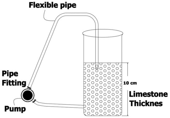 After selecting suitable materials and lithology, pilot scale experiments were performed using a polyethylene acrylic barrel (60 cm diameter) with a surface area of 0.25 m2 and height of 100 cm [57]. These barrels were filled with successive layers of the selected limestone. Treated mine water was collected at the bottom by placing perforated pipe/tile drains at bottom of the barrel and along the barrel’s diameter, as shown in Figure 6. Circulation was maintained with the help of a peristaltic pump with a pumping rate of 10–20 L/h in order to avoid any clogging and maintain simultaneous flow in the body of filter. Treated water was sampled at every half-hour interval during the first 7 h, then again after 24 h, then daily day, and finally after durations of two and three weeks. Two types of filters were designed using selected Wargal limestone, as described below.