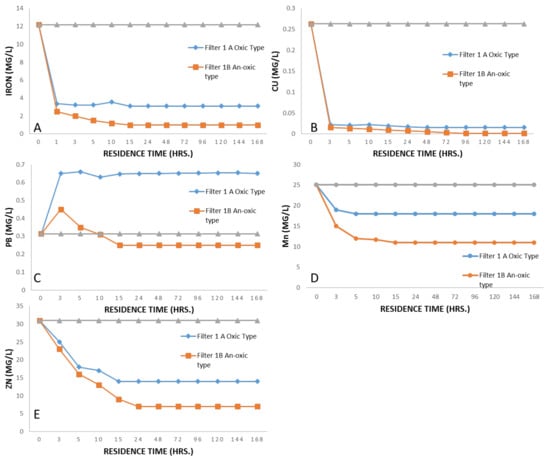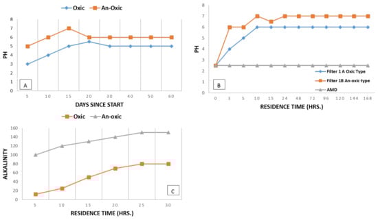 Our laboratory experiments demonstrated the changes in AMD chemistry in the context of neutralization when brought into contact with the limestone of the designed filters. Because influents were recirculated with the installed pump, these tests may mimic kinetics such as the length of buried limestone‘s drainage system, mostly adopted in many parts of world [53]. The pH, alkalinity, and Ca of treated water were calculated and are summarized in Table 1 and Table 2. All of these parameters were assessed for both uncoated (fresh) limestone and coated limestone to determine the longevity of designed filters. For these two conditions (coated and uncoated), alkalinity, pH, and Ca concentrations increased during the first few days; thereafter, they approached equilibrium or steady state conditions within approximately two weeks of continuous contact. An asymptotic trend indicates the declining efficiency of limestone dissolution with the passage of time, especially as the effluent approaches equilibrium.