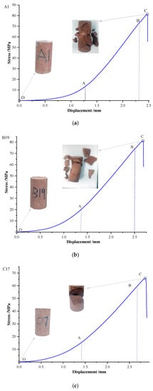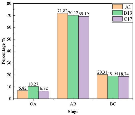 - Microfracture compaction stage (OA segment): At this stage, no microcracks are generated, all work done by the testing machine is converted into the elastic energy of the rock sample, and there is basically no energy dissipation. The energy absorbed by the three rock samples was 4.06, 7.67 and 6.72, and the corresponding ratios of the entire process were 6.82%, 10.27% and 6.72%, respectively. The rate is small but slowly increases.