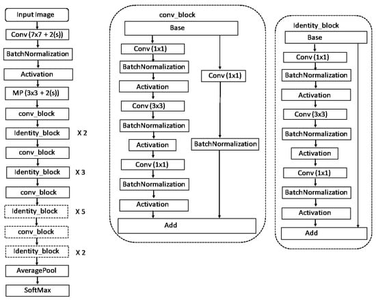 ResNet-50 was developed by Kaiming He et al. in 2015 [41]. Instead of using a standard sequential network such as VGGNet, it is a deep neural network that is composed of many different building blocks. This model has been trained to classify images into 1000 different categories. This model has 175 convolution blocks and one classification layer with 1000 neurons and Softmax activation function. The layered architecture of ResNet-50 is illustrated in Figure 1.