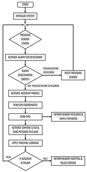 The designed hardware device contains sensors and actuators to detect an accident and its intensity. A force sensor is used to identify the accident which is mounted on the vehicle chassis. The force sensor is connected to the ATMEGA328 microcontroller to detect accidents and raise the alarm system. If the speed and force’s values exceed a predefined threshold, Tspeed and Tforce, an accident will occur. When the accident is detected, it will first activate the alarm for 30 s. If there is no accident or the accident is average or negligible, the driver can reset the force sensor and alarm controller by simply pressing a button. NodeMCU will send the nearby mechanics’ information to the registered mobile that can be used to resolve any technical issue in the vehicle. If the button is not pressed before 30 s, it will send a legal accident signal to the ESP8266 module. The ESP8266 module will activate the camera and send video, photos, GPS data, and other items to the Master Controller Raspberry Pi. The GPS data are also sent to the LCD display to show GPS information captured by the GPS module [51,52]. Pseudocode for accident detection is shown in algorithm 1.