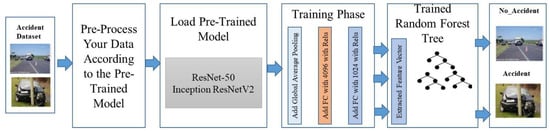 Deep learning algorithms have been greatly improved over the last few decades and may now be used in any domain with high accuracy [49,50,51,52,53]. Most of the existing ADRS just identify the accidents either using IoT sensors or deep learning. As a result, as soon as an accident is identified, information is transmitted to all emergency numbers. These approaches may have a higher false detection rate because they depend entirely on the sensor. So, if the user stops their car suddenly, the existing solutions detect it as an accident. To minimize the false detection rate, we are using a transfer learning-based pre-trained model named ResNet and InceptionResnetV2. These models are trained to classify input video into two classes, i.e., accident or not accident. If the model’s output is accident, then only the accident location is shared with the emergency services.