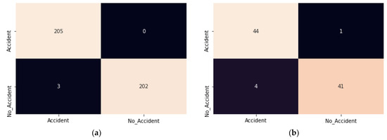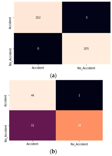 Comparative studies of ResNet-50 and InceptionResNetV2 are shown in Figure 17. Both the models give the same training accuracy (99.3%), but ResNet-50 has more test accuracy than the InceptionResNetV2. Furthermore, ResNet-50 has an almost 100% recall rate of accident class. It means there is less probability of an accident class being classified into a no accident class. An efficient ADRS should have a minimum false positive rate; therefore, ResNet-50 is a better choice for developing an accident detection model compared to the InceptionResNetV2.
