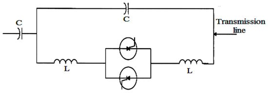 Series Controllers inject voltage in series with the line. They are used to reduce the transfer reactance of a power line and hence increase transmission line capacity and improve system stability. Examples of series controllers are Thyristor Controlled Series Compensator (TCSC) and Static Synchronous Series Compensator (SSSC) [42]. Figure 1 shows the structure and form of TCSC designed with two-directional thyristors.