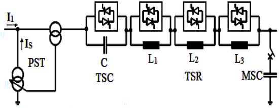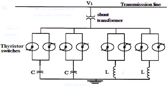 The SVC is designed with Thyristor Switched Capacitor (TSC) and Thyristor Controlled Reactor (TCR) or Thyristor Switched Reactor (TSR), as shown in Figure 3. The TSR is used to absorb reactive power, while the TSC is used to supply reactive power [45].