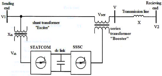 These controllers have combined shunt and series controllers, which have sophisticated control. A real power exchange can occur through their shared DC link when the shunt and series controllers are jointly used. The Unified power flow controller (UPFC) is a series-shunt controller. It is considered one of the most versatile and powerful FACTS devices in the power system today [46]. It is primarily used for flexible control of powers for better voltage stability. It allows concurrent or independent control of these parameters with transfer from one control scheme to another in real-time. Figure 6 depicts the schematic diagram of UPFC.