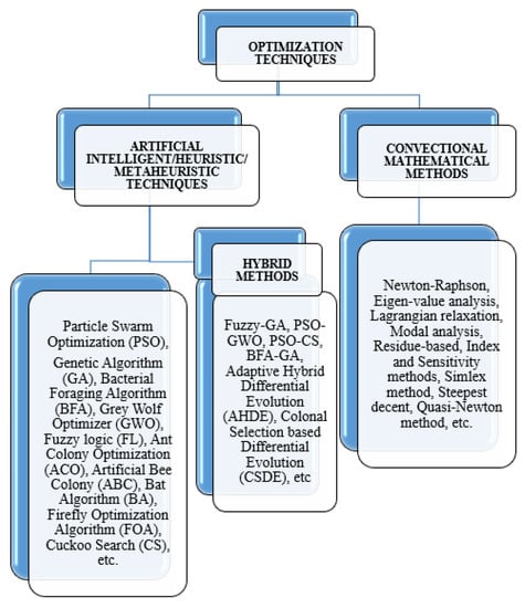 The optimal location, operation and control of FACTS controllers have been the focus of research in the area of FACTS installation and utilization in power systems. Due to the complexity of the power system network, successful installation and utilization of FACTS controllers are conducted, subject to certain constraints. Therefore, most optimal utilizations of FACTS devices are executed as constraint optimization with multi-objectives commonly geared towards general enhancement of power system quality, reliability, and security. Several optimization solution techniques have been utilized to solve the constraint-multi-objectives problem of FACTS placement, operation and control in the power system network. These optimization techniques are classified in Figure 9 as convectional mathematical methods and artificial intelligence techniques. The artificial intelligent techniques could be metaheuristic approach or hybrid metaheuristic approach.