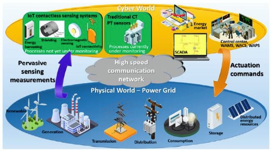 Most energy distribution utilities currently control their network with a supervisory control and data acquisition (SCADA) system. It is a centralized system that monitors and controls the distribution network’s behavior utilizing available data from the network system parameters. The current utilization of the SCADA in the distribution network limits response time, which can be improved upon by emerging advanced distribution system automation (DSA) [121]. Some of the new DSA devices employ sensing and intelligent system to provide fault prediction and enhance system protection. Figure 10 illustrates the integration of a cyber-system to a physical power grid.