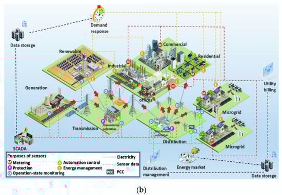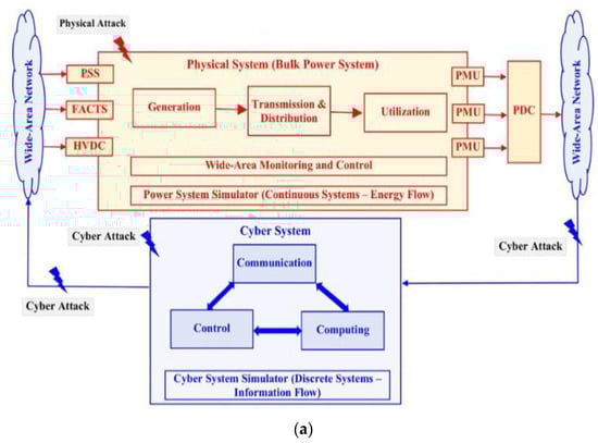 Padhy [125] proposed the modification of FACTS with an adaptive time delay compensation scheme that requires the signal modal information, such as frequency, amplitude, and damping. With this information, the latency can be compensated by predicting future trajectories of oscillatory response. According to Bibhu, this scheme can serve as a Wide-Area damping controller designed to address the issue of sampled-data control. Furthermore, D-FACTS has been considered for deployment in a CPPS for coordinated protection against false data injection cyberattacks (FDI) in a moving target defense (MTD) strategy [126,127,128]. The proposed defense strategy by Zhang et al. [126] works by actively perturbing the branch parameters needed to make up the false data injection attacks and thwart any further attack with optimally deployed D-FACTS device at each branch. The strategy protects the state estimation from being independently modified. The protection of state estimation against cyberattacks is very important, considering “its fundamental function of the energy management system, which calculates the optimal estimate of system’s state variables with explicit model and sensor measurement collected by SCADA system” [126]. To further the effectiveness of MTD strategy, Liu and Wu [127] presented an expanded MTD-based AC optimal power flow model. The reactance of D-FACTS lines is considered as decision variables to find a trade-off between MTD effectiveness and the system losses. Then, a new algorithm for optimal placement of the D-FACTS devices was developed and utilized to maximize the composite matrix rank of the MTD strategy in detecting false data injection attacks. On the other hand, Li et al. [128] investigated the feasibility and limitation of using D-FACTS devices as a proactive false data detection strategy. The investigation was conducted considering three types of FDI attacks; single-bus FDI, uncoordinated multiple-bus FDI, and coordinated multiple-bus FDI attacks. It was concluded that the strategy is capable of detecting all three types of FDI attacks on buses or super-buses with degrees large than 1, if the D-FACTS controllers are placed to at appropriate branches but the strategy failed to detect FDI attacks targeted on buses or super-buses with degrees equaling 1. Figure 11a,b depicts a conceptual and sectional view of modern CCPS.