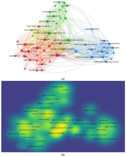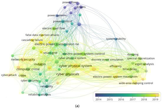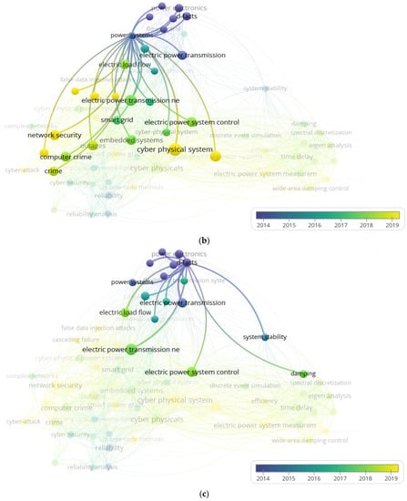 Furthermore, Figure 13a–e depicts overlay visualization of the keywords in the focus areas, which can be utilized to determine research trends within the period under consideration. From 2014 to 2015, the focus of research in the area of CPPS and FACTS/D-FACTS was on the network overlay of keywords with purple color in Figure 13a. The keywords network overlay with green color were the dominant focus of research between 2015 and 2018. From 2017 to 2019, the research focus shifted gradually towards the network overlay of keywords with yellow color. The purple color keywords are listed as cluster 2 in Table 3. Also, in Figure 13b, “power systems” is highlighted as a reference keyword to show the strongest links that determine the focus area of cluster 2. The strongest links of this cluster points to the integration of D-FACTS in power system for optimal power flow, power control, and power system stability. Similarly, “D-FACTS” was highlighted in Figure 13c, and the links show its application in the power system during the period (2014–2019) and, hence, the direction of future application. Figure 13d,e highlighted “electric power system control” and “cyber-physical power system”, respectively; the outputs show a closely related network overlay of similar keywords the formed cluster 1, 3, and 4 of Table 3. These clusters are mainly green and yellow colors. The link between Figure 13d,e points towards the transition of research focus from convection electric power system control to electric power control in a cyber-physical power system. The network overlays of Figure 13c–e show that “electric power system control” (Figure 13d) is the common dominant factor between “D-FACTS” (Figure 13c) and “cyber-physical power system” (Figure 13e). However, there is a very weak link between “D-FACTS” and “cyber-physical power system”. This weak link shows a research gap to be explored in the future.