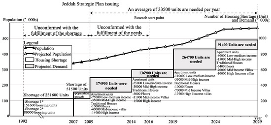 Population growth in Jeddah, the total housing shortage, and the projected housing demand up to 2029 (* Refers to shortages mentioned in Figure 6).