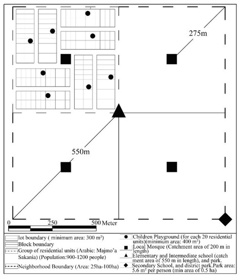 - As Saudi Arabia is an Islamic country where mosques are used five times a day, the mosques in several residential blocks are centrally located within a service area distance of 200 m, as noted in the PMPRLS. Therefore, we conceptualized the elements of a neighborhood by situating them within an area having a radius of 200 m from a centrally positioned mosque.