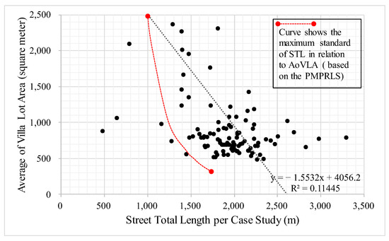 - We performed two verifications in the following cases: (1) where the total areas of streets (as shown in the PMPRLS) accounted for 20% of the total neighborhood area, and (2) when the minimum street width was 10 m (as shown in the PMPRLS). Subsequently, we determined how these conditions can affect the ratios of other elements, such as the total area of public facilities, the total street length, the number of villas, and population density.
