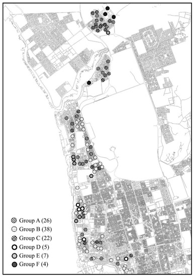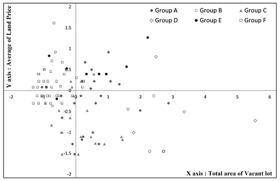We applied Ward’s method to perform cluster analysis using the standardized scores for six criteria associated with villa development and the net ratio of vacant lots, the ratio of villa lots having areas ranging between 300 and 400 m2, the ratio of villa lots having areas ranging between 1000 and 1400 m2, the average land price, the total area of vacant lots, the distance between a mosque and a park, and the total road length (Figure 14, Figure 15 and Figure 16). The 103 target areas were categorized into six groups (Figure 17). The characteristics and recommendations for reducing the net ratio of vacant lots are presented below.