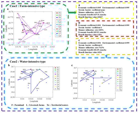 Regional manure distribution schemes. (a) is the optimization result of the manure distribution scheme in the farm-intensive area selected in this paper. (b,c) are the optimization results of the manure distribution scheme when the barrier coefficient is 1 and 2 in the water-intensive areas selected in this paper, respectively.