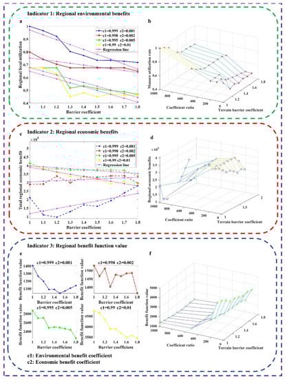Analysis of benefit loss of terrain obstruction. (a) is the image of the relationship between regional manure utilization rate and barrier coefficient, and the image of the regression line. (b) is the three-dimensional graphs of the relationship between the regional manure utilization rate, barrier coefficient and coefficient ratio. (c) is the image of the relationship between regional economic benefit and barrier coefficient, and the image of the regression line. (d) is the three-dimensional graphs of the relationship between the regional economic benefit, barrier coefficient and coefficient ratio. (e) is an image of the relationship between the benefit function value and the barrier coefficient under the combination of four coefficients. (f) is the three-dimensional graphs of the relationship between the benefit function value, barrier coefficient and coefficient ratio.