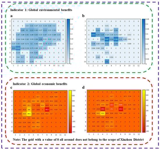 Heat map of manure discharge rate and economic benefits before and after optimization. (a) is the heatmap of the manure discharge rate in Xinzhou District before optimization. (b) is the heatmap of the manure discharge rate in Xinzhou District after optimization. (c) is the heatmap of the economic benefits of manure returning in Xinzhou District before optimization. (d) is the heatmap of the economic benefits of manure returning in Xinzhou District after optimization.