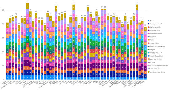However, it was not possible to achieve all of the MDGs’ objectives, so that the Sustainable Development Goals (SDGSs) were adopted by the United Nations (UN) in 2015 including: 1. no poverty, 2. zero hunger, 3. good health and wellbeing, 4. quality education, 5. gender equality, 6. clean water and sanitation, 7. affordable and clean energy, 8. decent work and economic growth, 9. industry, innovation and infrastructure, 10. reduced inequalities, 11. sustainable cities and communities, 12. responsible consumption and production, 13. climate action, 14. life below water, 15. life on land, 16. peace, justice and strong institutions and 17. partnerships as a common way of acting to try to end poverty, protect the planet and ensure that by 2030 the entire planet can enjoy prosperity and peace [7]. Even so, it has been stated that by 2030 only 53% of variables regarding sustainable development will have been achieved [8]. This information can be seen in Figure 1 and Figure 2. Figure 1 shows a worldwide spectrum image of the SDGS index, while Figure 2 shows the SGD index countries by order of their achievement regarding the SDGSs’ 17 goals.