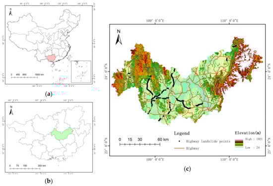 The city of Laibin is located in the central Guangxi Zhuang Autonomous Region (as shown in Figure 1b), between 108°24′~110°28′ E and 23°16′~24°29′ N. It is characterized by high terrain in the middle and low terrain on both sides, with a total area of 13,411 square km. It belongs to the transitional monsoon climate area, where the four seasons are distinct and the rainfall is sufficient, gradually decreasing from the southwest to the northeast. The average annual temperature is 20.3 ଌ and the average annual rainfall is 1360 mm. According to statistics, there are 641 highway landslide points in Laibin, mainly distributed in the central area (as shown in Figure 1c).