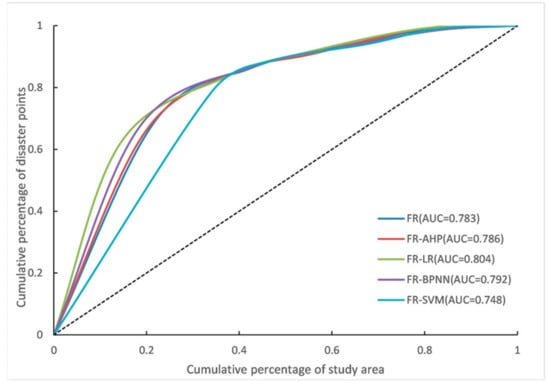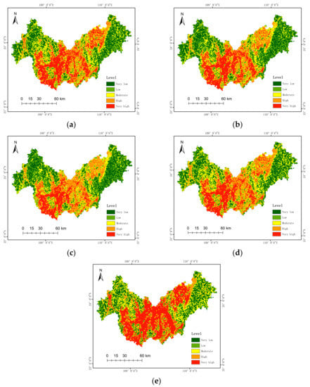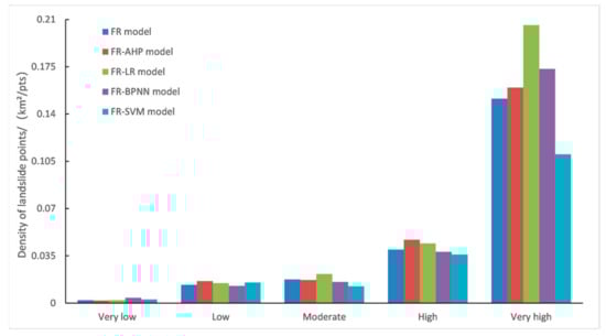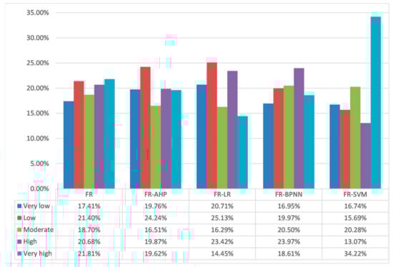 In this paper, the susceptibility to highway landslides was analyzed and evaluated through a single model and four coupling models (FR-AHP, FR-LR, FR-BPNN and FR-SVM), and the natural break method were used to classify the result maps for each model into five categories: very high, high, moderate, low and very low (as shown in Figure 3 and Table 3).