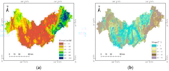 The elevation, slope and aspect data used in this paper are 90 m resolution STRM-DEM data, STRM-SLOPE data and STRM-ASPECT data, which all come from the Geospatial Data Cloud (http://www.gscloud.cn, accessed on 13 April 2022). Precipitation data, meanwhile, are from the National Meteorological Science Data Center (http://data.cma.cn, accessed on 13 April 2022). The vegetation coverage data, at a 1000-m resolution, come from the Institute of Geographical Sciences and Resources, Chinese Academy of Sciences (http://www.resdc.cn, accessed on 13 April 2022).