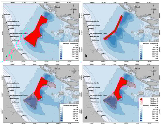 Management measures implemented in the Pomo/Jabuka Pits area since July 2015. Panel (a) shows (in red) the area closed to trawl fishery from 26 July 2015 to 16 October 2016, other types of fishing activities such as longlines are permitted throughout the area. Panel (b) presents (in red) the area subjected to a ban on all fishing activities and an area (red sparse grid) where a limited number of licences and fishing days for trawlers are allowed from 1 October 2016 to 31 August 2017. Panel (c) reports (in red) the area closed to all fisheries from 1 September 2017 and the areas (red sparse grid) closed to all fishing activities until 31 October 2017 and then managed through special licences. Panel (d) refers to the establishment of a fishery restricted area: Zone “A” (in red) is closed to all fisheries, zone “B” (red sparse grid) where the closure to fishing activities is from 1 September to 31 October, then fishing is regulated with licences and with two days of permits per week (one for the twin nets), and zone “C” (red sparse grid) where the closure to fishing activities is from 1 September to 31 October, trawling is authorised through special licences on Saturdays and Sundays from 5.00 am to 10.00 pm, gillnets, pots, and longlines authorised, can fish there, from Monday at 5.00 am to Thursday at 22.00 pm.