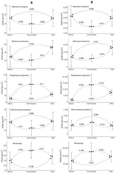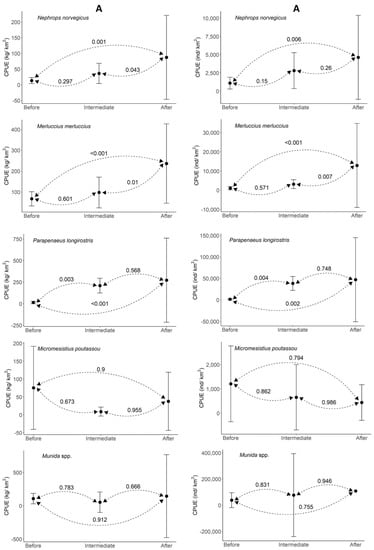 Plot of catch per unit effort (CPUE) by species (rows) and type of index (columns) as a function of the Closure factor levels (BEFORE, INTERMEDIATE, AFTER) for stratum “B”. Points and error bars represent means and 95% confidence intervals, respectively. Dotted arrows indicate the post hoc pairwise comparisons and the number above is the respective p-value. Tukey’s post hoc test was carried out on all pairwise comparisons except for the biomass index (kg/km2) related to P. longirostris, on which the Games-Howell post-hoc test was applied.