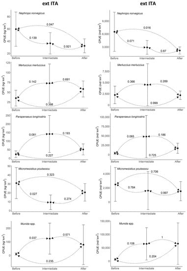 Plot of catch per unit effort (CPUE) by species (rows) and type of index (columns) as a function of the Closure factor levels (BEFORE, INTERMEDIATE, AFTER) for stratum “ext ITA”. Points and error bars represent means and 95% confidence intervals, respectively. Dotted arrows indicate the post hoc pairwise comparisons and the number above is the respective p-value. Tukey’s post hoc test was carried out on all pairwise comparisons except the biomass index (kg/km2) of P. longirostris and the density (ind/km2) of Munida spp., on which the Games-Howell post-hoc test was applied.