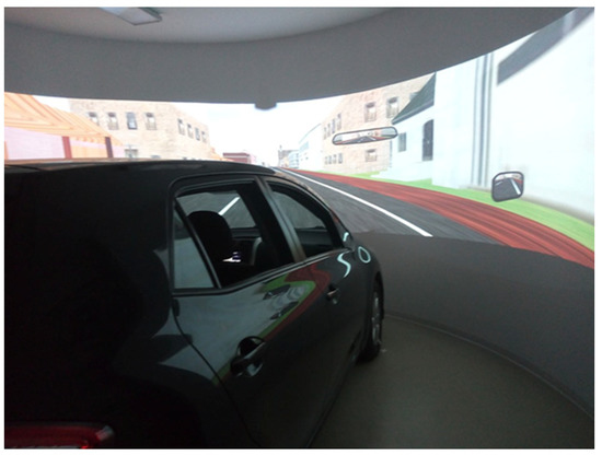 The simulator is equipped with a driving simulation software called STISIM Drive. The reliability of this driving simulator as a tool has been fully validated by several studies [48]. From the hardware point of view, the simulator is a real vehicle, a Toyota Auris, converted to a driving simulator by removing all unnecessary parts and integrating the vehicle with the components that communicate with the workstation, equipped with the software STISIM Drive. The system is also equipped with high-definition projectors that project the scenarios in front of the car and sideways on a curved projection screen that covers a visual angle of 135°. Furthermore, there are sound speakers which are located in the hood of the car in order to emulate the acoustic environment.