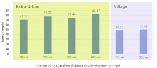 It must be noted that the difference between the average speed levels for segment with intersection separation distance of 100 m and 300 m is slightly more (also with higher statistical significance level) in case of the extra-urban segments than in the village segments, perhaps due to the lower speed limits present within the village as explained before.