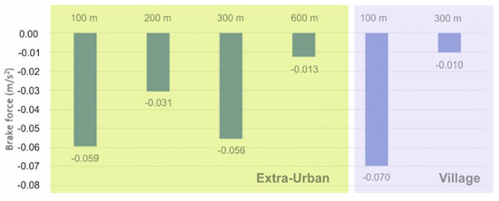It is interesting to observe the results from Figure 6 not only individually, but together with Figure 3 and Figure 5. Although the number of brakes used to reduce speed decreased with decreasing intersection density, in case of an intersection separation distance of 300 m, the total amount of brake force and average brake force values were a departure from a similar trend. Results from the ANOVA, Welch, and Brown–Forsythe test in this case reported p values as 0.00. The Games–Howell test results showed that differences in total brake force are significant at 0.05 level for all pairs except for the pair 100–300 m. This shows that for the extra-urban case of 300 m intersection distance, there is not only more sporadic speed fluctuation behavior than the case of 200 m, but also with relatively higher pressure on brakes.