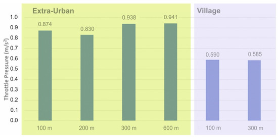 In the case of the villages, the average acceleration due to throttle was slightly higher for the case of 100 m than 300 m, but the difference was less, probably due to the lower speed limit present within the village.