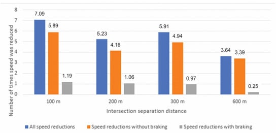 When driver sees a vehicle entering the road in front of him, he assesses the situation and if he perceives it to be risky, he takes necessary action, most commonly by reducing speed. Departure from the trend for the driver performance measures in the extra-urban case of 300 m intersection separation distance was suspected to be stemming from different speed increment-reduction behavior present in this said case. Therefore, in order to further explore drivers’ risk perception with regard to intersection separation distance and verify the suspected reason behind the aforementioned case of departure from trend, speed reduction counts, i.e., the number of time when speed was reduced in each of the extra-urban segments, were calculated. It must be noted that the numbers are not integers as the numbers were averaged for all the drivers and then normalized for the length of the segments as the total length of segments with different intersection density levels were not the same in the scenario. In fact, to have a significant and balanced number of cases with different intersection densities, it was necessary to adopt a system with different segment lengths. Therefore, the length of each group (100 m, 200 m, 300 m, and 600 m) was normalized with respect to the total length of each group of segments.