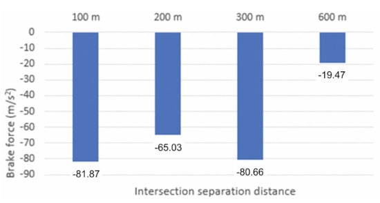 It can be observed that the average value of acceleration due to throttle is higher for segments with 100 m and 300 m intersection separation distance than that of the segment with 200 m intersection separation distance. However, from a more general point of view, along with the results shown in Figure 2 and Figure 3, it can be seen that these segments (100 m and 300 m) also have higher deceleration values due to more use of braking than in the case of 200 m.