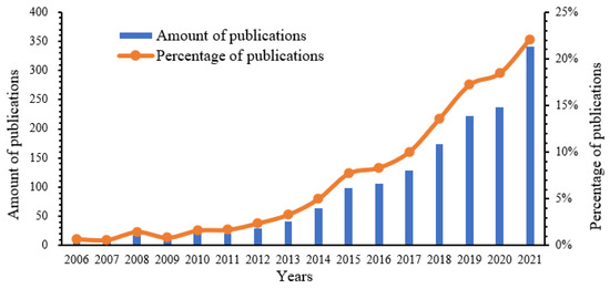 The amount of WEF publications published between 2006 and 2021 along with their percentage growths is plotted in Figure 1. The figure shows that research on WEF has continued to rise since 2006, and the increasing trend has accelerated significantly since 2015.