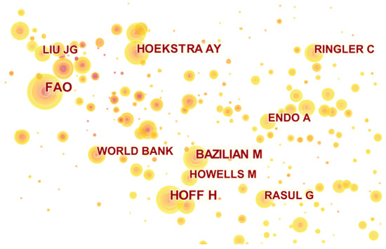 The co-cited author network was composed of small independent sub-networks and the top three co-cited author networks were headed by FAO (385 times), Hoff H (356 times), and Bazilian M (298 times) (Figure 2). The sub-network centralised around the FAO is an intensive research group containing at least ten nodes. The FAO is an official international organisation for world food and agriculture. Liu of Michigan State University is one of the closest co-cited authors with the FAO. His research emphasises environmental protection in the relationship between humans and nature [3]. Another sub-network was headed by Hoff from the Potsdam Climate Research Institute. He is committed to solving the growing water gap in food production. They propose that energy, agriculture, trade, and climate must be considered when managing water [4,5]. In the sub-network, Bazilian considered the future energy supply as his research point. He also examined the integration of WEF with systemic thinking [6,7].