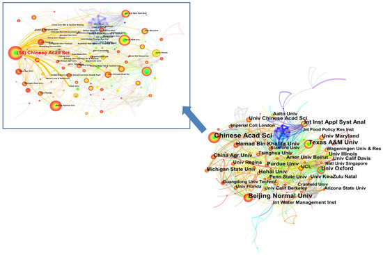 Figure 3 shows a network of collaborations between research institutions. Similar to the co-citation author network, the size of the node represents the number of each institutional publication. The connection between nodes indicates the existence of a cooperative relationship; the thicker the links, the more intense the cooperation between them. Figure 3 shows that the top five institutes are the Chinese Academy of Sciences (CAS, 54 papers), Beijing Normal University (47 papers), University of Texas (38 papers), International Institute of Applied Systems Analysis (27 papers), and Oxford University (25 papers). The papers published by these institutions account for 12.3% of the total articles issued. Taking CAS as an example, there are 54 extended lines in Figure 3, representing more than 50 co-operators of CAS. The United Nations Economic and Social Commission for Asia and the Pacific (ESCAP) has the closest cooperation relationship with the CAS, followed by Clark University, the Ministry of Land and Resources of China, and the China Agricultural University.