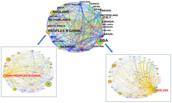 With the development of globalisation, cooperation among different countries is inevitable. The national cooperative network of WEF research is shown in Figure 4. Each node represents a country, and the size represents the number of publications from that country. The thickness of the line represents the degree of cooperation. Publications in the United States have maintained a leading position with China close behind. The top five centres in the national cooperation network were the United States (554 papers), China (300 papers), England (187 papers), Germany (139 papers), and the Netherlands (98 papers). If we consider the United States and China as examples, we can see that the United States is still the most active country engaged in cooperative research with others, while Germany and Kazakhstan have the closest cooperative relationship with China. From the perspective of the nationwide distribution of cooperation networks, Europe (901 papers), North America (653 papers), and Asia (567 papers) were the top three regions in international cooperation in WEF research.