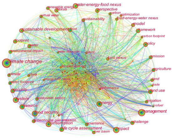 Keywords represent the core contents of research fields. Keyword co-occurrence analysis is used to explore the most critical research topics by analysing the frequency and temporal changes. Figure 5 shows the co-occurrence evolution process of WEF research. The size of the node represents the frequency of co-occurrence of the keyword, and the thickness of the line indicates the degree of relevance between the keywords. Different colours represent different years, the warmer the hue, the closer the year, and vice versa. For example, the keyword “climate change” is the largest node. Initially, “climate change” was highly correlated with “land use”. Subsequently, “climate change” appeared with “system” and “security” and occurred simultaneously. In recent years, “climate change” is always linked with “nexus” and “sustainability”, which indicates that climate change is now accompanied by integrating research and sustainability development.
