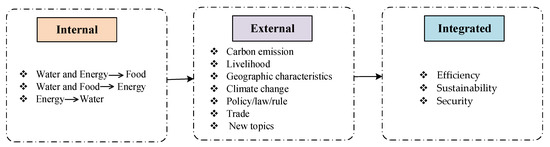 The internal research on the WEF nexus in this study is understood as the interaction among water, energy, and food systems. Based on the above basic nexus, the internal research is arranged from three aspects: water and energy → food; water and food → energy; and energy → water.