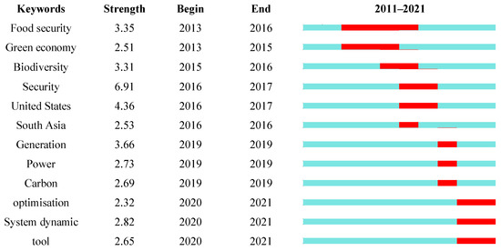 Citation burst is an indicator automatically calculated by CiteSpace. It represents a sudden frequency increase of a keyword in a certain period. Citation burst analysis is used to detect emerging dynamic concepts and potential hotspots in a field and is suitable for examining emerging trends and sudden changes in the development of disciplines, reflecting active or cutting-edge topics. It is commonly used for frontier analysis. Figure 8 shows the citation burst results since 2011. The time axis is represented by the light blue line and the burst keyword is represented by the red line. Keywords with high strength represent research frontiers in a certain period.