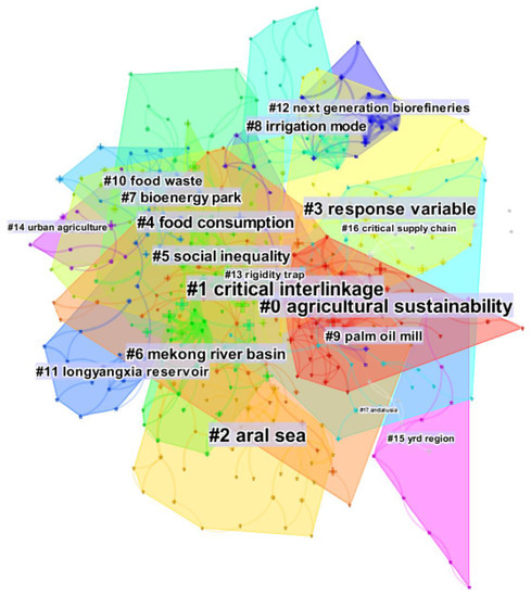 The knowledge cluster analysis is conducted on the basis of keyword co-occurrence of WEF nexus. The area of each cluster is composed of related nodes, representing different subjects and characteristics of the WEF nexus. In Figure 9, the clusters are ordered from 0 to 17: the smaller the number, the more keywords included.