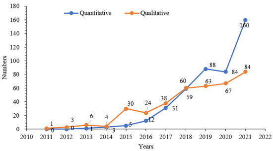 WEF nexus research methods can be divided into qualitative and quantitative methods [88]. Qualitative methods focus on framework construction and descriptive analysis, while quantitative methods are used for quantification, prediction, evaluation, and optimisation. As shown in Figure 10, scholars tend to use qualitative analysis at the beginning of their studies. During the past three years (from 2019 to 2021), quantitative methods have gradually surpassed qualitative ones. This means that an increasing number of institutions and scholars have focused on the mathematical methods of the WEF nexus.