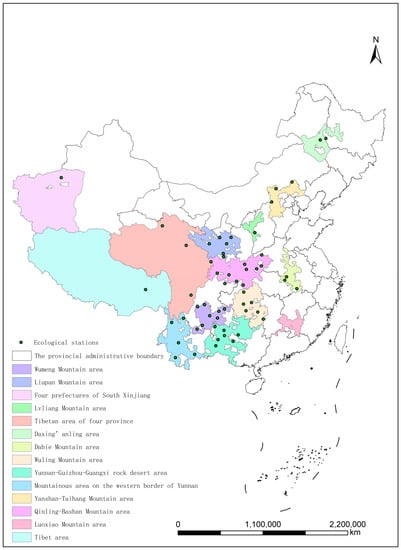 The study area (Figure 1) was selected according to the regions defined by the Outline for Development-oriented Poverty Reduction for China’s Rural Areas (2011–2020) [1], and included 14 areas: the Dabie Mountains area, the Daxing’anling area, the four prefectures of southern Xinjiang, the Liupan Mountains area, the Luoxiao Mountains area, the Lüliang Mountains area, the Qinling–Bashan Mountains area, the Tibet Autonomous Region, the four provinces with Tibetan prefectures, the Wuling Mountains area, the Wumeng Mountains area, the Yanshan–Taihang area, the Yunnan–Guizhou–Guangxi rock-desert area, and the mountainous area on the western border of Yunnan.