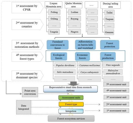 The GGP is a very large and complex project and is suitable to be divided into multiple homogeneous ecological-assessment units for evaluation [32,33,34]. We conducted a scale transformation of the ecosystem services, utilizing a distributed-evaluation method [34] (Figure 2). This method evaluated the ecological benefits associated with the GGP on five different levels, each at a smaller scale of detail, i.e., Level 1—CPSR (14); Level 2—administrative region (689); Level 3—restoration method (3); Level 4—forest type (3); and Level 5—dominant species. Ultimately, 35,828 relatively homogeneous assessment units were determined. Regional results were obtained by converting the results of all relatively homogeneous assessment units via forest-ecological correction coefficients and statistical principles [33].