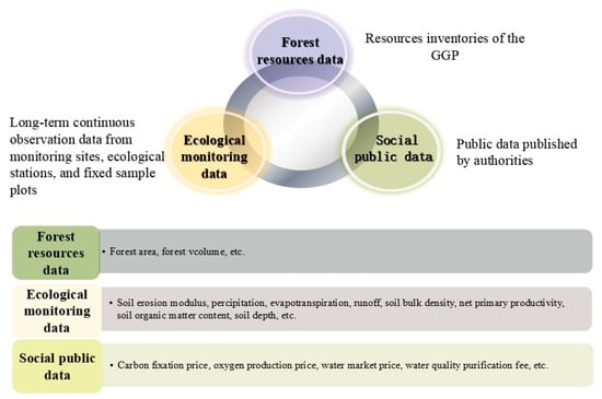 Data used in this study were obtained by using long-term monitoring and conducting field surveys based on the national-standard system (Figure 1). Additional forest-resource data were provided by the State Forestry and Grass Administration of the GGP management center, and public data were collected from the relevant authorities. Socioeconomic data were collected from the counties within the GGP using surveys, questionnaires, and data from the provincial administrative departments. More details of the data collected are given in Figure 3.