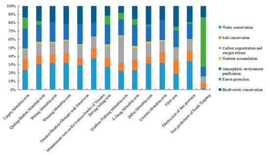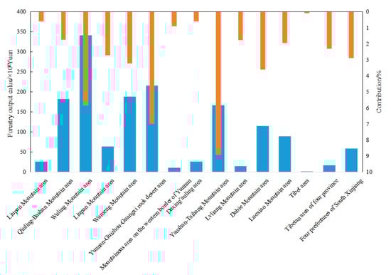 The quantity of ecosystem services of the GGP in the CPSR is summarized in Table 3. The overall ecological benefit was 5.6 × 1011 RMB/a, equivalent to 7.9% of the national forestry-output value, as well as equivalent to 6.5 times the total value of the central government’s special poverty-alleviation program. Among the 14 areas, the Qinba Mountains area had the largest ecological benefit (1.08 × 1011 RMB/a), followed by the Wuling Mountains area, because of the large area of the project and the location of the area.